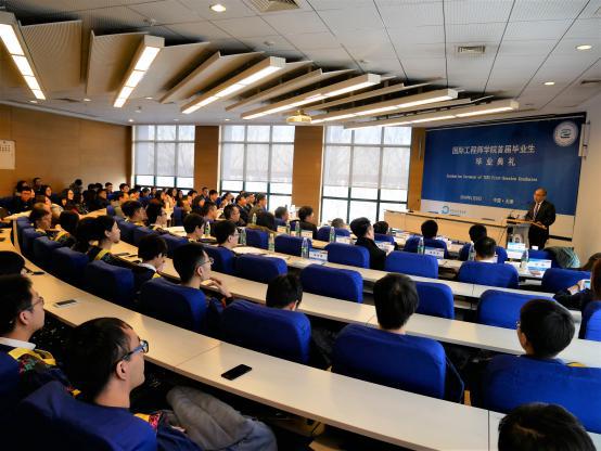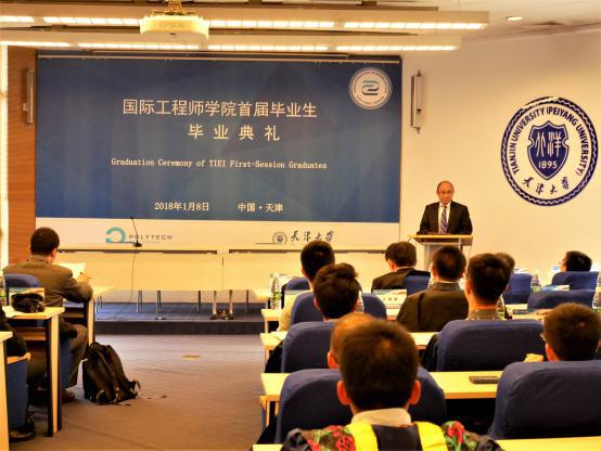 (Correspondent: Liu Yingtong) On January 8th, 2018, TIEI graduation ceremony of the first-session graduates was solemnly held in the 8th meeting room, the conference building of Weijin Road Campus, Tianjin University. Representatives of 15 enterprise club members including Hu Lingbing, general manager of Tianjin Metallurgy Group, Yu Jiaxin, chairman of China Construction 6th Engineering Division Corp., Ltd, Hu Hongwei, former director of iFLYTEK limited company and present general manager of Guangdong Qiming Technology, Zheng Ailin, operation director of semiconductor microcontroller business division, Asian region of NXP (China) Management Co., Ltd were present by invitation; Xiao Shuhu, vice director of students’ affairs department and director of employment guidance center, Shan Xiaolin, party secretary and Luo Zhen, vice director of Qiushi Honors College, Yin Na, supervisor of Polytech Group EU Erasmus+ Program, teacher representatives of TIEI and all the graduates attended this ceremony. The ceremony was hosted by Shan Xiaolin.