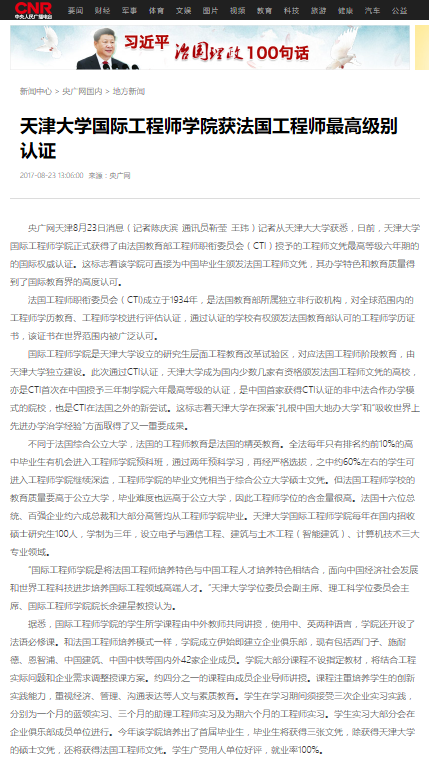 CNR Tianjin August 23 (Journalist: Chen Qingbin, Correspondent: Jin Ying, Wang Wei) The journalist learned from Tianjin University that Tianjin International Engineering Institute (TIEI) has formally passed the international authoritative accreditation of the engineer diploma granted by CTI (Comité des Titres Ingénieur Français)of the highest level --- 6 years. This means that TIEI can issue the French engineer diploma to the Chinese graduates directly, and its characteristics of institute-running and the education quality have been highly acknowledge by the international education circles.