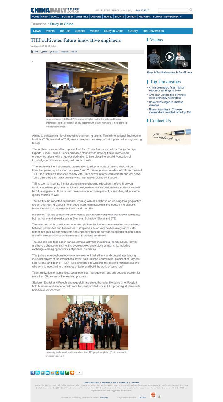 June 6th, Chinadaily.com.cn published the article reporting TIEI with the title of “TIEI cultivates future innovative engineers”. TIEI was established in May, 2014, has operated the institute-running with the cooperation of Polytech Nice-Sophia, and aims to become the first-rate international engineering institute that is “open, international and innovative”. The institute at present has 3 specialties of electronics, computer science and architecture and civil engineering. TIEI accords with the French engineer training model, combines with the enterprises’ requirements for the engineering talents, and makes active explorations in the fields of teaching reform, university-enterprise cooperation and else. It fully utilizes the international education resources, enhances the cooperative relations with the government and enterprises, and continuously improves the quality of institute faculty, teaching level, teaching condition, students’ employment and so on. TIEI strengthens students’ fundamental knowledge of mathematics and physics, and meanwhile focuses on the training of their humanity qualities, management ability and the innovative capability of engineering practice, so as to make them become the international engineering leading talents with overall strength that promote the engineering scientific and technological progress of the future world.