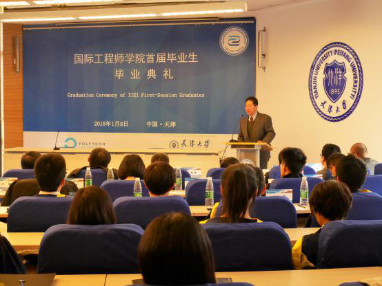 (Correspondent: Liu Yingtong) On January 8th, 2018, TIEI graduation ceremony of the first-session graduates was solemnly held in the 8thmeeting room, the conference building of Weijin Road Campus, Tianjin University. Representatives of 15 enterprise club members including Hu Lingbing, general manager of Tianjin Metallurgy Group, Yu Jiaxin, chairman of China Construction 6thEngineering Division Corp., Ltd, Hu Hongwei, former director of iFLYTEK limited company and present general manager of Guangdong Qiming Technology, Zheng Ailin, operation director of semiconductor microcontroller business division, Asian region of NXP (China) Management Co., Ltd were present by invitation; Xiao Shuhu, vice director of students’ affairs department and director of employment guidance center, Shan Xiaolin, party secretary and Luo Zhen, vice director of Qiushi Honors College, Yin Na, supervisor of Polytech Group EU Erasmus+ Program, teacher representatives of TIEI and all the graduates attended this ceremony. The ceremony was hosted by Shan Xiaolin.