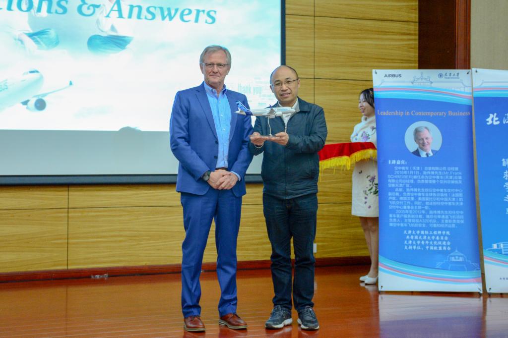 Frank SCHREIBER as the keynote speaker of Peiyang lecture hall, first of all, he introduced the history and development of the leading aircraft manufacturer, Airbus, to the on-site teachers and students. Airbus is gradually developed from the original single-channel A320 series and wide-body A310 series, the long-range wide-body A330 series and the new wide-body remote A350 series to the ultra-long-range double-layer A380 series. It is reported that Airbus has delivered more than 6,700 aircraft since it was put into operation in 1974. Later, he brought a wonderful report to the teachers and students on the “key role of business leaders and how to develop leadership”. Frank SCHREIBER combined theory, practice and experience through simple and easy-to-understand examples, giving teachers and students some unique insights, and hoped that in the near future, they will help students to innovate and surpass themselves and develop individual leadership awareness when they step into the society.