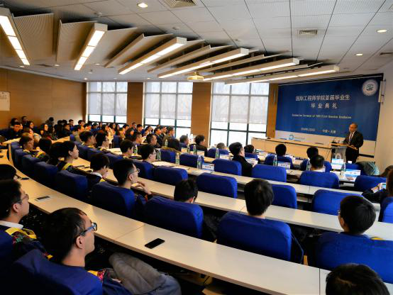(Correspondent: Liu Yingtong) On January 8th, 2018, TIEI graduation ceremony of the first-session graduates was solemnly held in the 8thmeeting room, the conference building of Weijin Road Campus, Tianjin University. Representatives of 15 enterprise club members including Hu Lingbing, general manager of Tianjin Metallurgy Group, Yu Jiaxin, chairman of China Construction 6thEngineering Division Corp., Ltd, Hu Hongwei, former director of iFLYTEK limited company and present general manager of Guangdong Qiming Technology, Zheng Ailin, operation director of semiconductor microcontroller business division, Asian region of NXP (China) Management Co., Ltd were present by invitation; Xiao Shuhu, vice director of students’ affairs department and director of employment guidance center, Shan Xiaolin, party secretary and Luo Zhen, vice director of Qiushi Honors College, Yin Na, supervisor of Polytech Group EU Erasmus+ Program, teacher representatives of TIEI and all the graduates attended this ceremony. The ceremony was hosted by Shan Xiaolin.