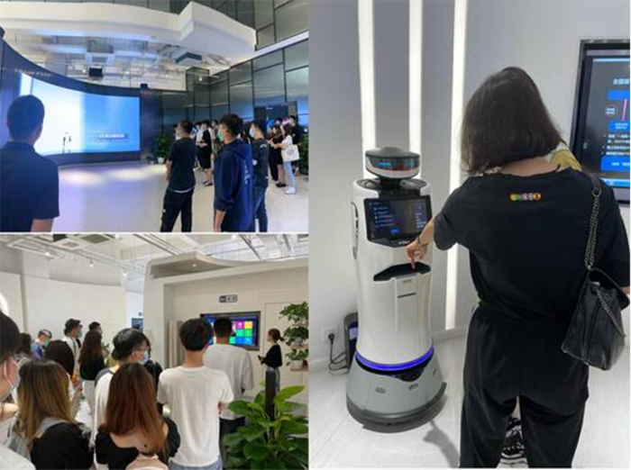 The narrator leadership the teachers and students of our college to introduce the intelligent applications of AI+Hearing, AI+Home, AI+Medical, AI+Education, AI+Government in detail, and demonstrations of the sector projects. With the narrator's detailed explanation, the students fully felt the innovative development and convenient services given by artificial intelligence in various fields, and plaints the rapid development of science and technology.