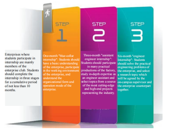 TIEI deeply integrating the teaching content with the educational objectives, students have three internship opportunities during their study at TIEI, i.e. a one-month blue-collar internship, a three-month assistant engineer internship and a six-month engineer internship.By themeans of step-by-step internship in enterprises for accumulative ten months, it "seamlessly connects" the school education with corporate needs.Students also can join theinternational practice, participation in research projects of foreign university and international competitions.