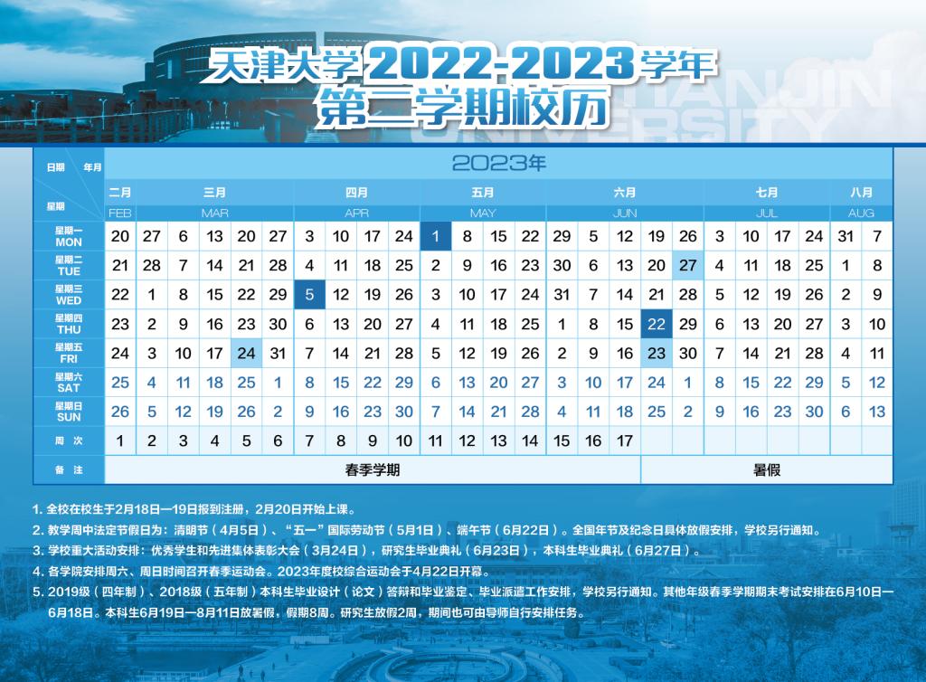 Tianjin University 2021 - 2022 Second Semester Academic Calendar